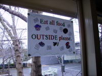 B校内の掲示 校内のあちこちに「飲食は 校舎の外で」という掲示が 見られた。 |